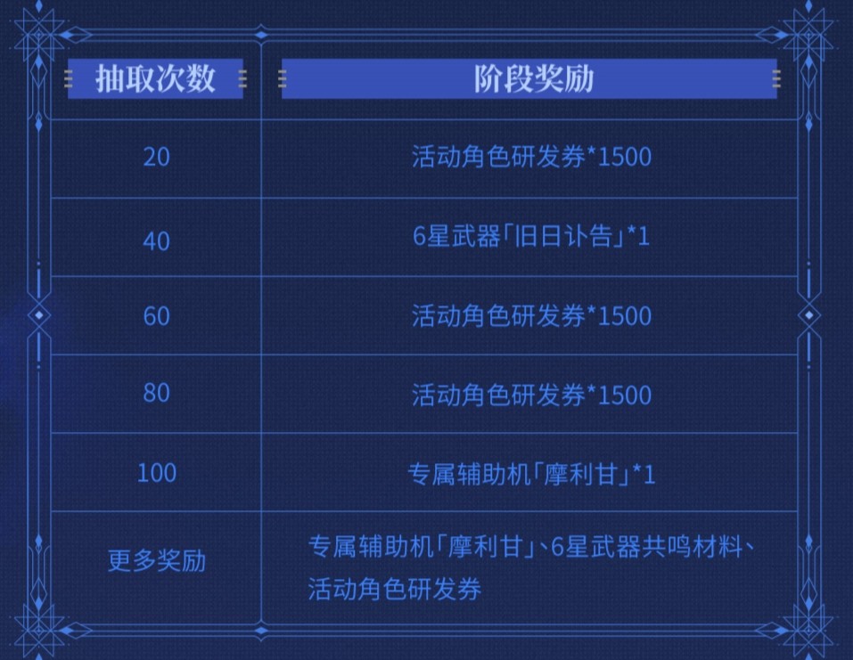 此外角色池抽卡返利,每20抽拿一档奖励,有黄票、专武和辅助机,后文会详细分析。