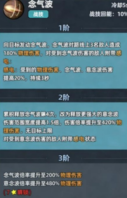 该技能为直线型攻击,对路径上最多3名敌人造成180%物理伤害,并在命中目标时施加“感电”状态。该状态本身不造成伤害,但至关重要:当处于感电状态的目标再次被“念气波”或“蓄念波”击中时,将额外承受20%伤害,持续3秒。