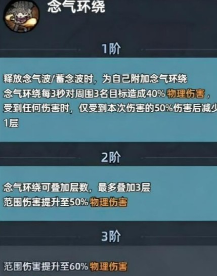 一星被动“念气环绕”提供战术容错:每次释放技能后,每3秒对周围敌人造成一次范围伤害,并为自身生成一个持续3秒、减伤50%的护盾。