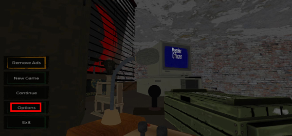 1、第一步打开边境检察官游戏,进入到主页面时,点击倒数第二行的设置即可,称之为:optinos,也是这个游戏的设置选项。