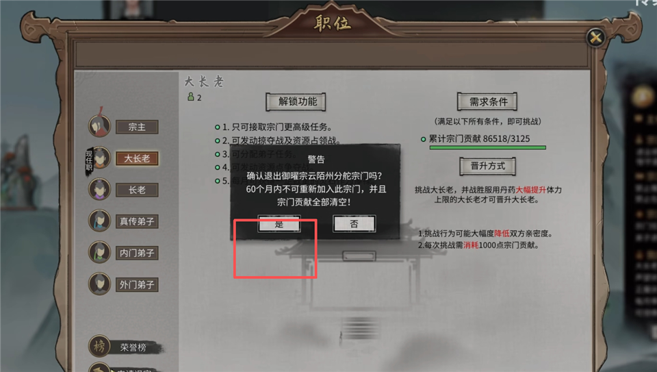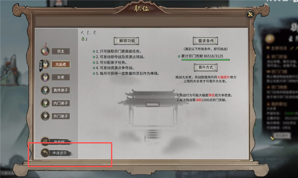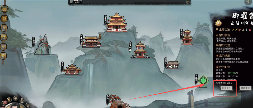 1、进入宗门内,点击右方的【职位晋升】。