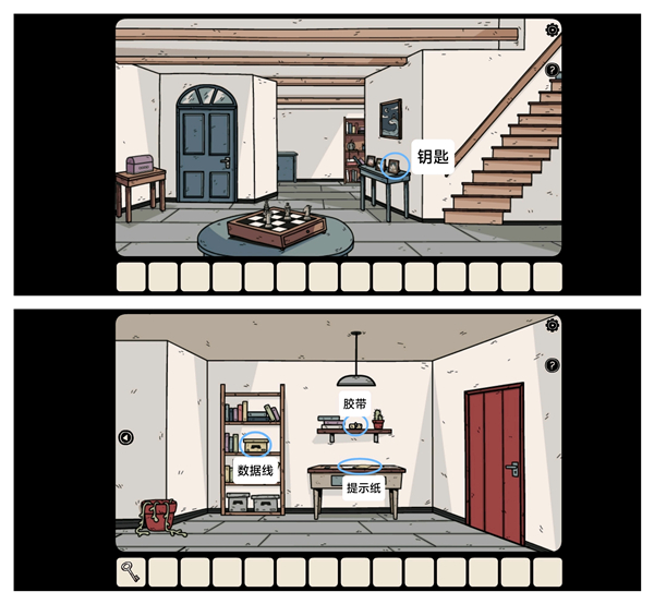 拿走相框背后生锈的钥匙,再到二楼右侧拿走数据线、胶带以及提示纸。