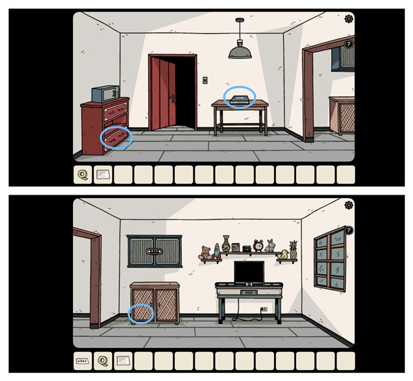 来到客厅触发剧情进入暗室,用砂纸清理墙壁上灰尘获得四个「图形密码」,接着打开左边的柜子拿到毛刷和美工刀。