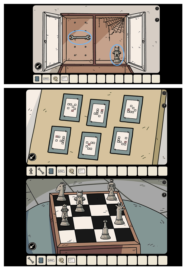 输入符号打开书柜拿到扳手和棋子,再观察留言板上的卡片(注意每个棋子对应的位置),接着将棋盘棋子放置正确的位置(如上图)获得电池。