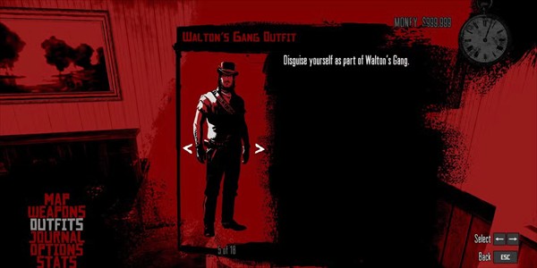 如何解锁:要找回这套服装,必须满足一系列条件:找到所有的碎片。在所罗门的愚行周围搜寻。完整的里奇伍德农场入室盗窃。在犰狳游戏中,击败所有人。带着沃尔顿帮派赏金(活着)返回。当沃尔顿帮派攻击乔拉泉时,保护它。所有的废料都去盗贼登陆的裁缝店买这套衣服。
