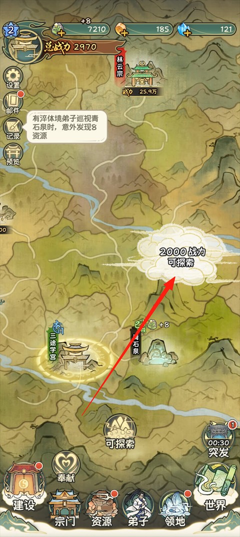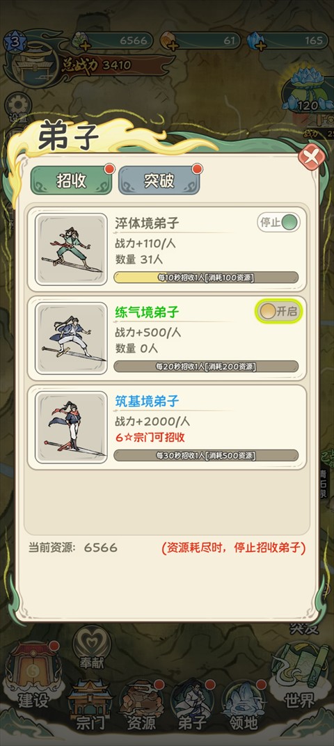 1、玩家需要招募弟子逐步占领这个世界,达到战力即可攻占