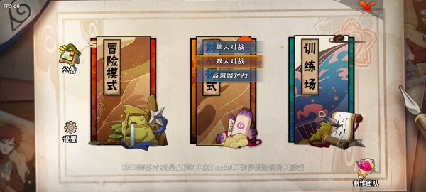 2、我们可以选择冒险模式、对战模式、训练场三种不同的玩法。游戏以冒险模式为主,对战模式可以自由选择角色战斗,支持联网游戏。训练场方便玩家练习和熟悉不同的角色。
