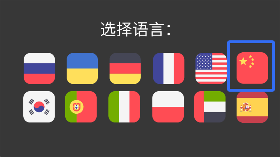 在首次进入游戏时,会出现旗帜代表语言的选择界面,我们选择五星红旗,就选择了简体中文。