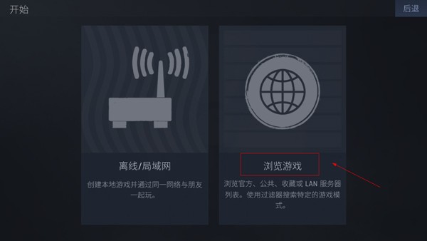 2、点击【开始】,选择【浏览游戏】即可进入服务器选择界面;
