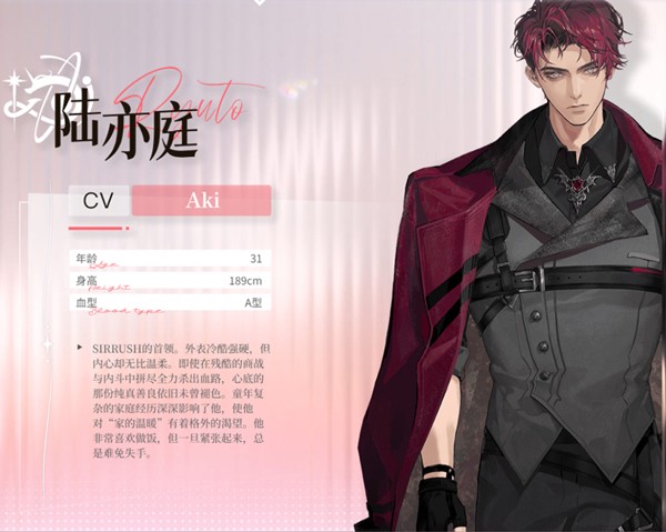 3、陆亦庭SIRRUSH的首领。外表冷酷强硬,但内心却无比温柔。即使在残酷的商战与内斗中拼尽全力杀出血路,心底的那份纯真善良依旧未曾褪色。童年复杂的家庭经历深深影响了他,使他对“家的温暖”有着格外的渴望。他非常喜欢做饭,但一旦紧张起来,总是难免失手。