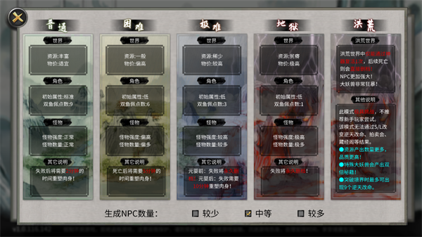 2、游戏开局难度分为普通、困难、极难、地狱、洪荒等等;