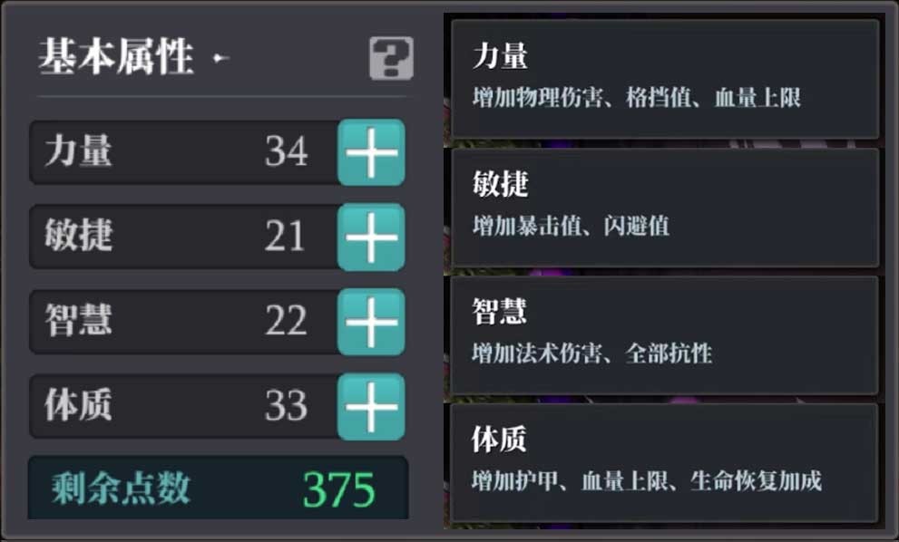 人物升级获得的加点属性,每升一级获得5点,75级共375点。除了穿装备要求以外,每项基本属性加点影响对应属性,如下图标签: