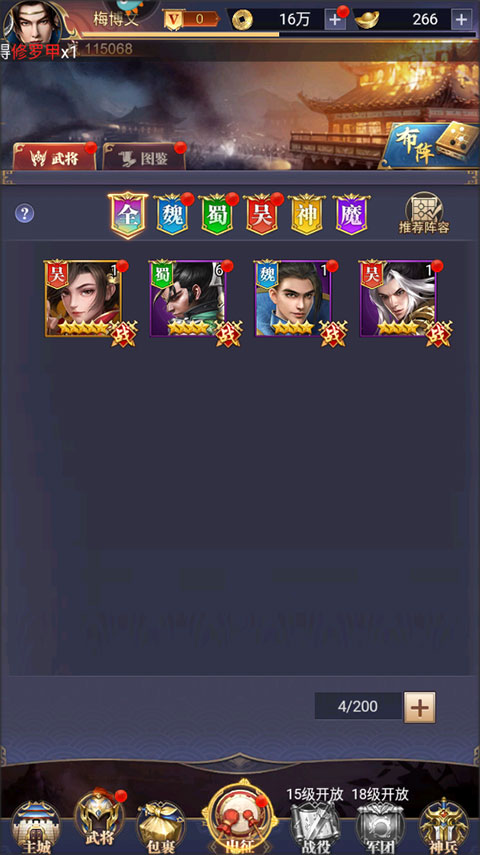 1、在游戏主界面点击武将,即可查看你所拥有的武将,点击推荐阵容。
