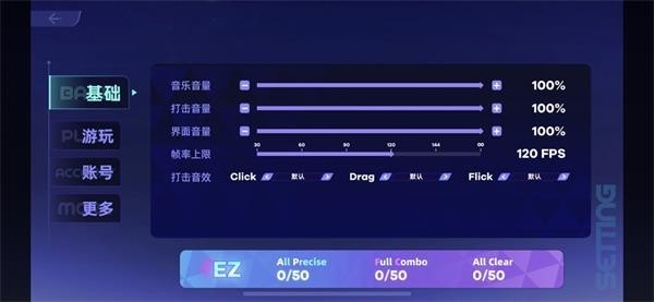 3、进入“基础”界面,可以对游戏的音量进行设置
