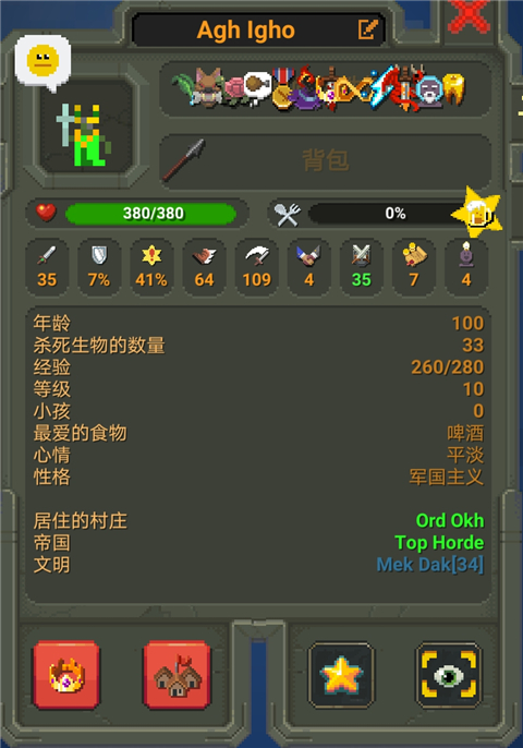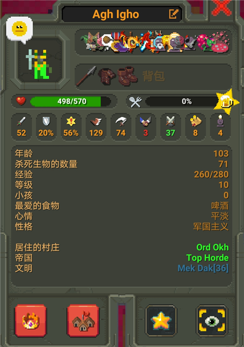 9、放置一些同种族单位建立国家,确保其他单位手里没有装备,让你选中的单位成为国王。国王会在一段时间后获得金牙特质。单位的年龄大了会自己获得明智特质。