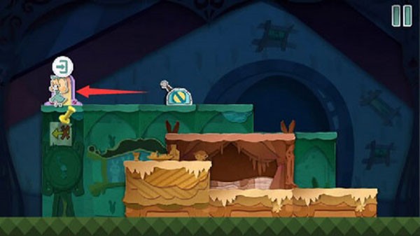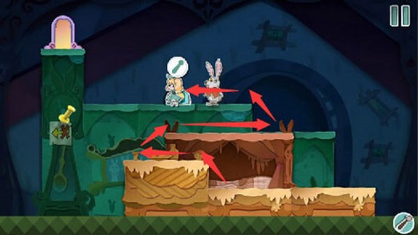 将带有拉杆的绿色方块移过来,移动到绿色方块上按下拉杆。
