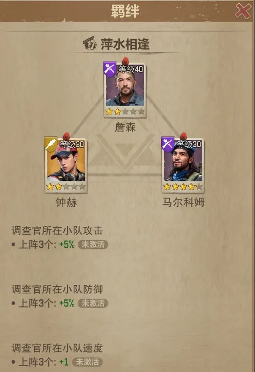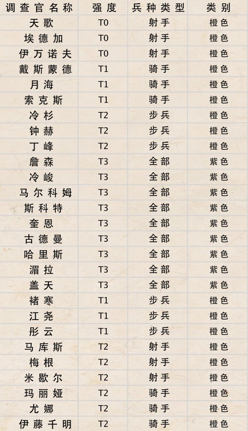 由于部分调查官(橙色)会有带队兵种的限制,建议普通玩家追求T3紫色调查官羁绊组合(紫色调查官无兵种限制),以及T2橙色调查官羁绊组合(使用免费的高级抽卡券,在高级卡池可以获取角色碎片)。