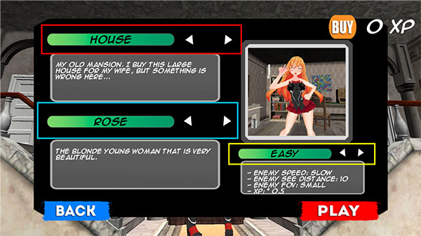 1、进入恐怖的妻子游戏,如下图,红框“house”可以切换场景地图,黄框“easy”可以调整游戏难度,蓝框“rose”可以切换不同形象的妻子,设定好后点击“PLAY”开始游戏。