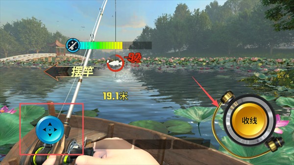 不过目前游戏只支持甩杆和刺鱼收杆的体感哦,左右摆杆、收线还需要点击屏幕操作,因此想体验完整体感功能的小伙伴,可以继续使用如下操作进行~