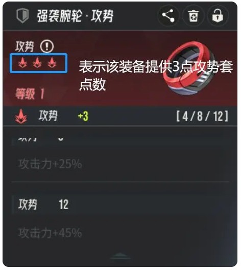 左侧三件对应的主属性依次为固定数值攻击,生命和防御。副属性词条在获得时随机,强化装备时每三级会优先增加一条副词条,或是随机强化一条已有的副词条(如果已有四个副词条)