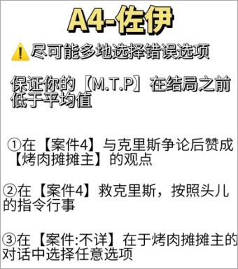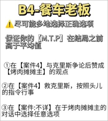 AB分支:在相同条件下,最后被SMAKS老大拿枪指着的时候选择第一条(较为积极的那条)进入A结局,选择第二条(较为消极的那条)进入B结局(同摊主线建议sl)。