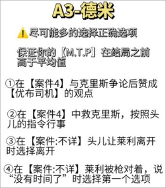 德米线进入前提:所有选项选高MTP的那条,在所有选项中支持德米,在遇见头儿后选择到后方支援而不是留在头儿身边。在警察局不要帮克里斯或在克里斯线中跳转到德米线(选择两次和德米有关的选项),