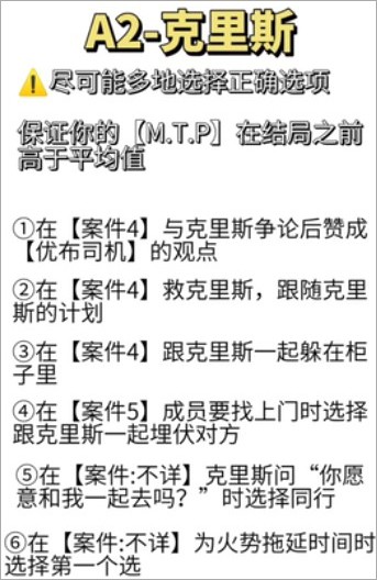 多选择克里斯的选项,最后在警局和克里斯躲着并躲在在一个柜子里保证两人都活着。同时,如果要你在摊主和德米之间选择,选德米那条比较积极的想法。注意,在克里斯线最终事件里反复提及德米或头儿可以跳转到德米线或头儿线。如果不想跳转,选择和克里斯相关的选项,