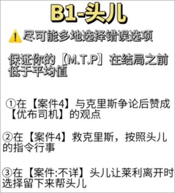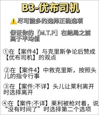 AB分支:听完他的一席话后会有一堆选项,在最后他掏枪的那个选项里,选择第一条“知道了。”进入A结局,选择了第二条“不对劲”进入B结局(建议sl把两个结局快速拿到)。