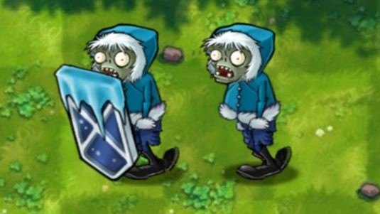 特点:免疫寒冷效果,在前方即将有平射类子弹击中自己时,雪盾僵尸会举起盾牌,将子弹反弹为雪球子弹,反弹时会扣血20,当雪盾僵尸距离子弹过近时会来不及举盾从而直接被攻击到,雪盾僵尸持有盾牌时将使用盾击,伤害50,但不会触发啃食效果,如魅惑效果。