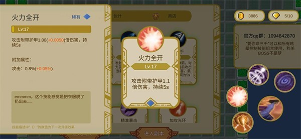 坚韧跟激光斩可替换。吸血也可替换记得选些回复百分比,技能升级优先cd,cd的buff跟罗宾汉可减少40cd,配合技能减cd,技能cd都在4秒内,血量下不来,可达千万穰,单位亿兆京姊穰,技能顺序叠血后怒意加aoe,优先血量,不选攻击,伙伴随意,奖励房优先10概率重置cd。