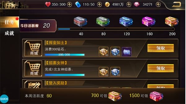 3、每天完成任务获得的活跃度,还可以累积起来解锁周活跃度奖励。当一周的活跃度达到700和1000的时候,都有超级丰厚的奖励可以领,更有高级召唤券在等你噢!