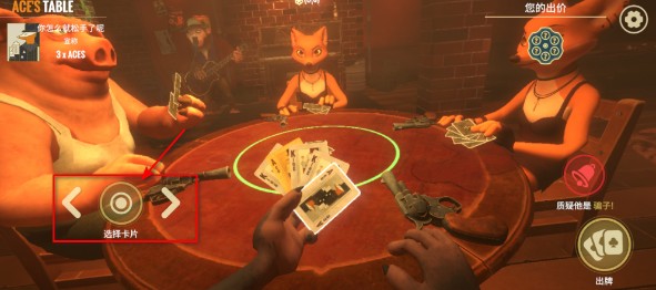 选择卡牌,左右滑动可以左右选择,点中间就是确定,选好就可以出牌,或者直接质疑他是骗子。