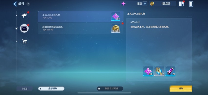 3、另外新手还会有20连抽可以领取,第一个签到+邮件。