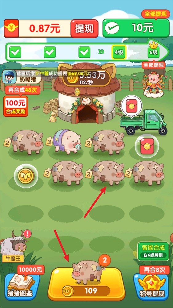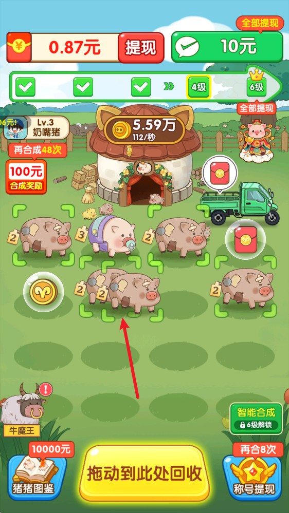 2、拖动相同的小猪重叠在一起即可合成,得到更高一级的小猪。