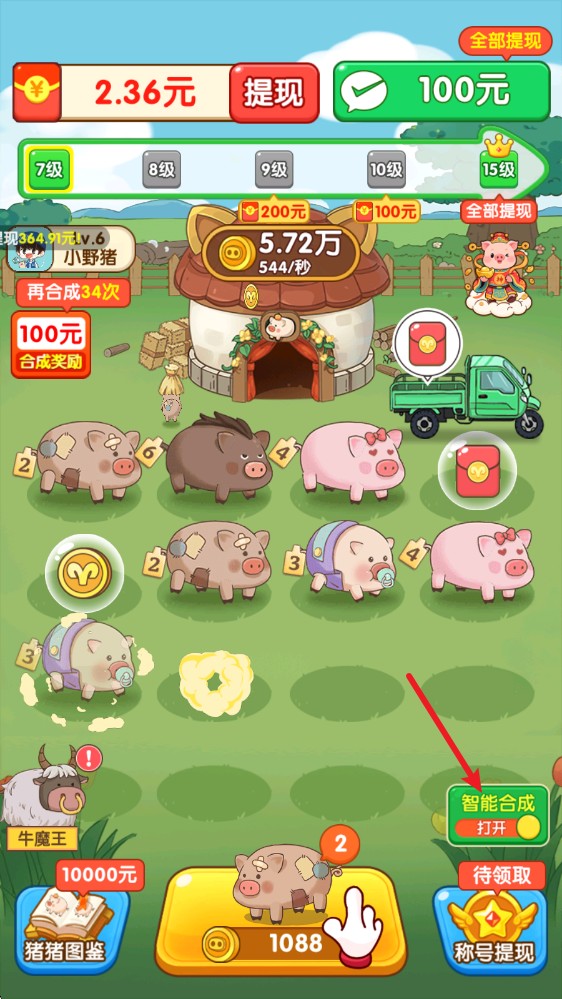 1、游戏中,我们点击下方按钮即可购买小猪,小猪等级会根据当前最高等级猪猪随机获得。