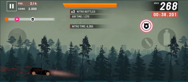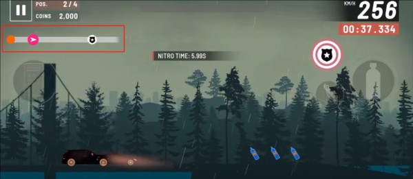 2、操作界面简洁直观:左侧区域控制加速与刹车,右侧为氮气加速道具键,右上角实时显示已行驶的公里数