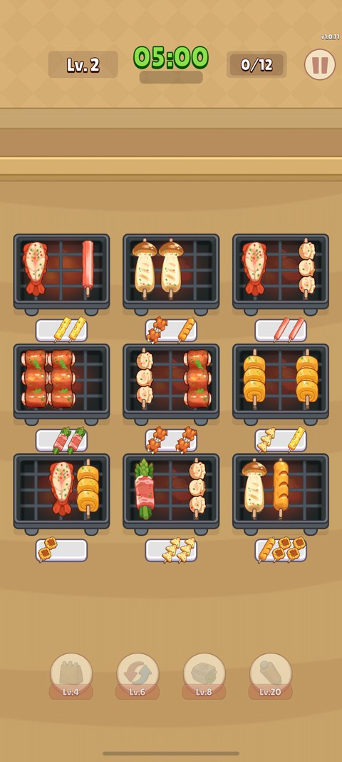 4、三个相同的烤串在同一个烧烤架上即可消除,而且还有多种道具可以使用;