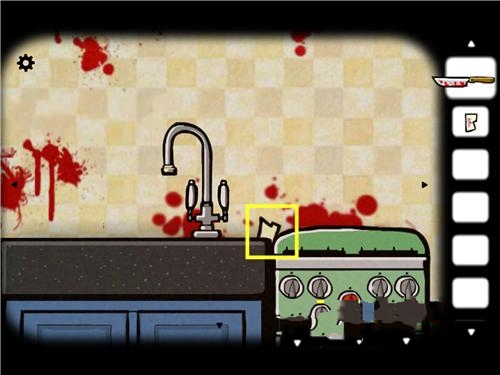 2、我们这次面对的不再是大钟的那面房间了,这次是厨房,有点恐怖的是,正面墙都是血,玩起来有点瘆的慌。我这时候点近水龙头那块,能发现旁边有一块相片碎片,赶紧的捡起来。仔细搜索一下,发现这里已经没有可探索的了。
