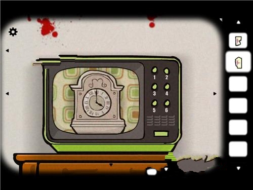 3、我们向右转,来到了火炉室,发现火炉竟然已经是烧的了,这下更恐怖了,明明没人啊。这时候我们更需要淡定,点开墙上的备忘板,可以发现纸片下有一片相片碎片,往下看,发现有一台电视,但是点开花屏貌似没有什么用。到这里为止,许多小伙伴可能就觉得这房间没什么可以探索了,可是,最关键的就在电视上,点开电视,发现电视的换台可以用,分别对应了数字,你按到4还是3的时候,电视就有画面了,都是显示的有关于数字的画面,我们只要按照他的画面提示,不停地换对应数字的台就好,最后就能取得方块啦。