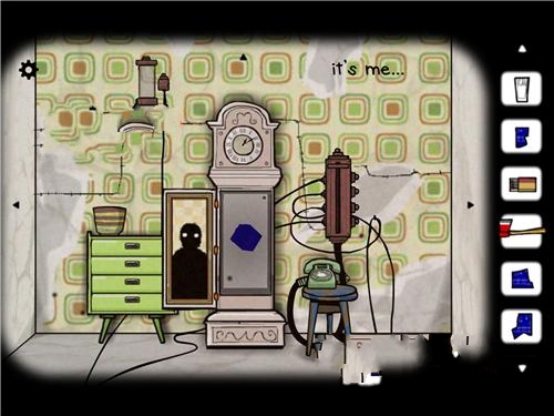 4、紧接着到了火炉房,同样是左上方的装置上拿到相片碎片,之后可以发现右下方桌子的一台收音机竟然是有电子钟的!上面显示着13:10.这个很重要,要记下来,拨动收音机也并没有更多发现。这时候我们迅速回到客厅,在中间大钟上调整时间,知道调为13:10分,此时下方的大钟柜子就能打开了,从里面可以取得最后一片相片碎片同时镜子里出现一个恐怖的黑色人影,不用管他,回到火炉房,用火柴点燃木头,拼好拼图,放入方块就通关了。