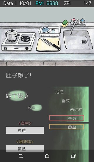 2、点击房间左下角的购物袋图标,打开食材清单。进食系统无即时数值反馈,角色多数时间保持卧床状态。当底部文字框出现“饿了”提示,则需消耗食品。佐料需用ZP在商店购得,食材每日刷新一次,当日份额耗尽后不再补充,该模块属于日常生存管理部分。