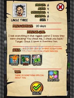 8、三叔,赌博盗窃样样精通,想要来钱快就需要找他,同时在游戏中还贩卖东西,绝对是监狱老手,新手玩家选择这个角色可能一下代入不了不建议新手使用。
