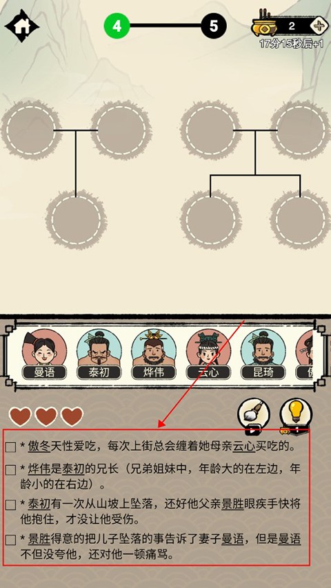 2、进入关卡后,玩家需要根据下方文字提示,将人物头像拖入上方合适圆框内,进行族谱的修缮。