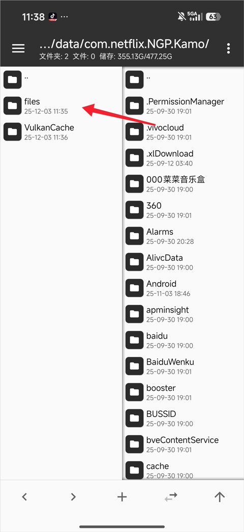 2、在列表中即可看到荒野大镖客救赎手机版的游戏目录,一般名称为com.netflix.NGP.Kamo,进入该文件夹后,继续打开Files目录。