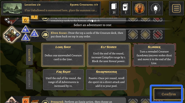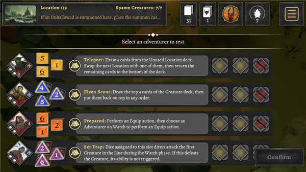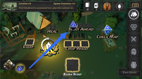 3、投掷骰子后,选择一位英雄在营地行动,其他三个英雄将会去前哨站攻击怪物。