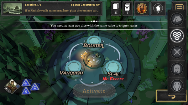 6、玩家需要放置至少两个相同点数的骰子激活符文。