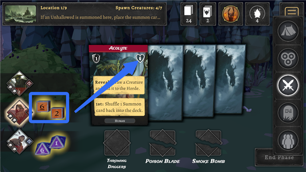 8、每个怪物的血量显示在卡牌右上角,使用骰子击败它,骰子点数消减血量。