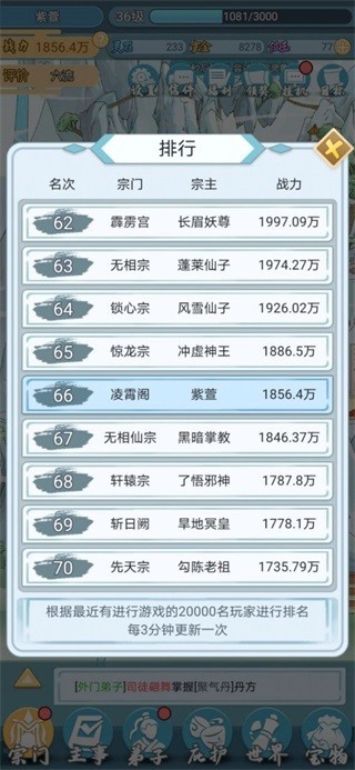 大比最主要的功能就是空出杂役弟子的位置和增加修为增长速度。只有空出杂役弟子的位置,才能不断招人,所以要每次大比都有前三才能保证宗门战力的高速增长。小技巧,前期强化宝物给弟子装备增长战力赢得前三,再全部卸下以此循环。不要看大比的打斗介绍花里胡哨,只要弟子战力达标就可以进前三,杂役弟子战力在2.5W左右就可前三,稳一点4W以上就可以第一(有时候也看运气,我有一次4.2W就落选了,一次3W第一),外门6.5W左右前三(7.5W以上第一),内门弟子11W前三(12W第一)。内门弟子前三可以升核心弟子或亲传弟子,怎么升亲传好像是随机吧,没测出来。大比尽量得第一,后面的大比,第一和第三的修为增长速度奖励差距越大。后期杂役大比包前三,尽量多加人进宗门。
