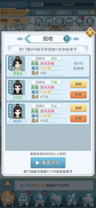 弟子面板分四个:资质,灵根,修为,战力。招人首先看灵根,其次看资质,修为的增长有3方面相加:资质,灵根,修为。