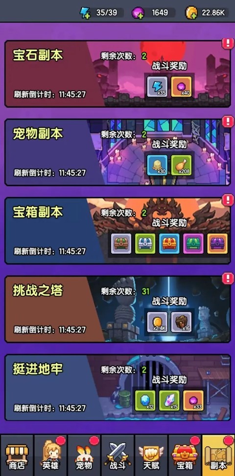 每通关一层,获得的体力和宝石会增加,层数越高奖励越多,每天有2次免费次数和2次看广告次数,必须全部完成!